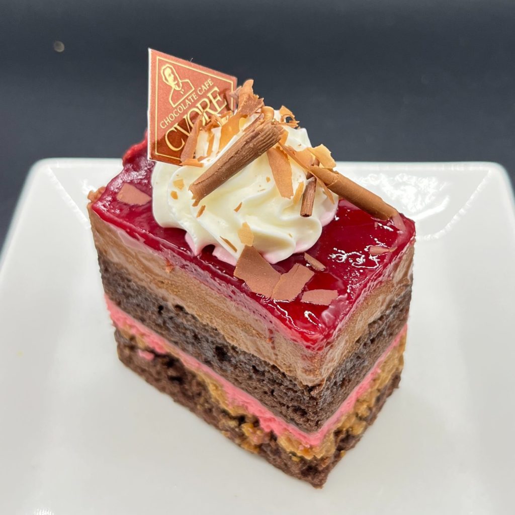 ヘーゼルナッツと70%カカオのチョコムースと甘酸っぱい梅のケーキ